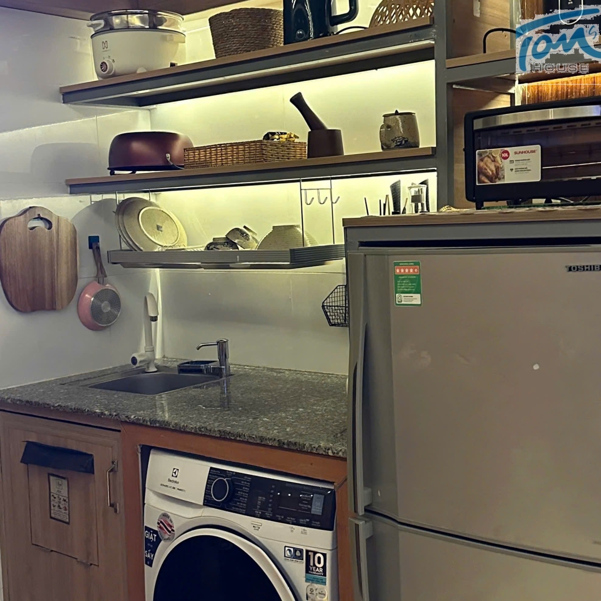 Ở góc nhỏ của căn phòng, bếp nấu ăn gọn gàng được chuẩn bị sẵn đầy đủ gia vị – chỉ chờ hai người cùng nhau nấu một bữa đơn giản mà ấm lòng. 🍳🥢