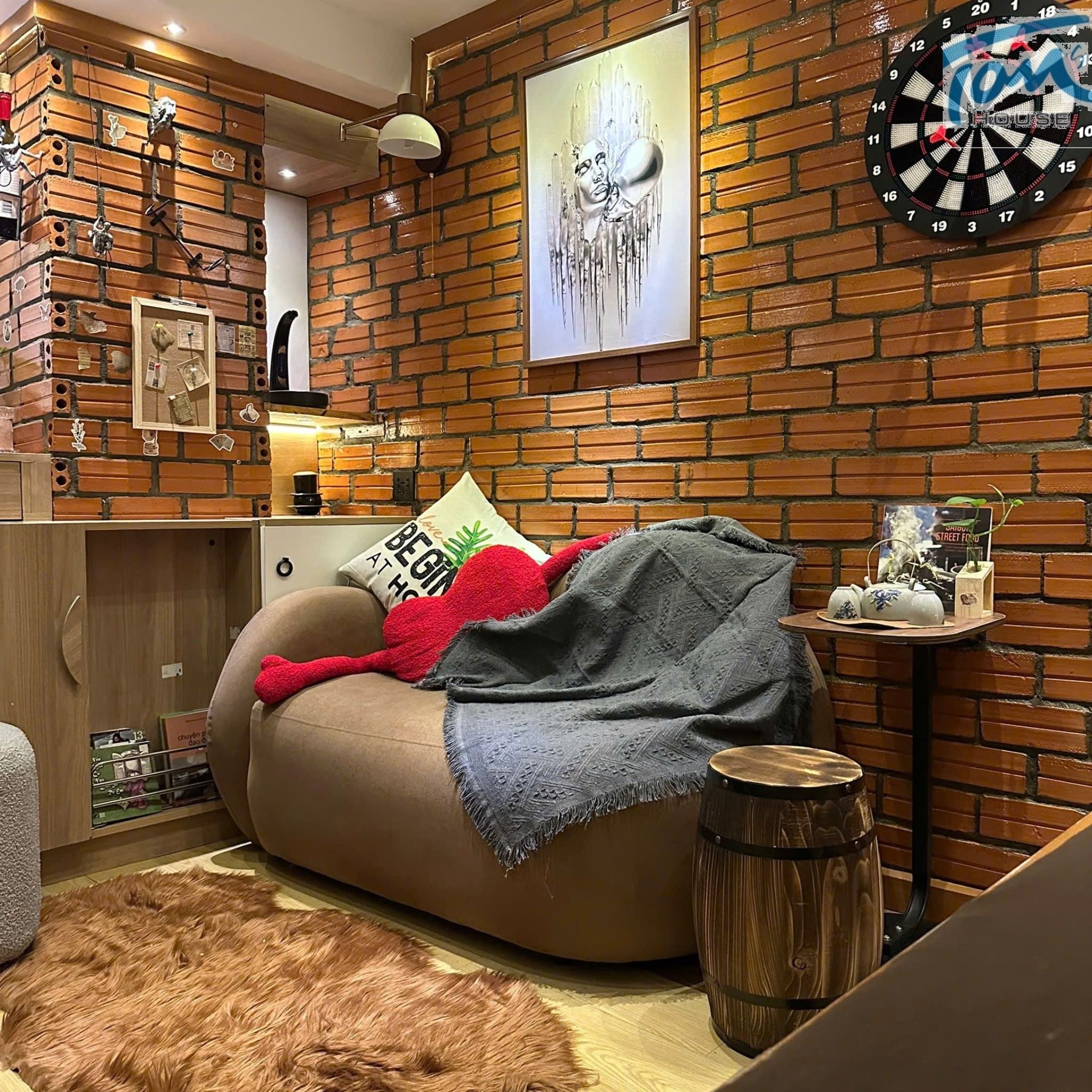 Ánh đèn vàng nhạt dịu dàng ✨, sofa vải thô mộc êm ái 🛋️, vài chiếc gối tựa linen xinh xắn 🎨, chiếc kệ gỗ gắn tường, lọ hoa khô đặt hờ hững...